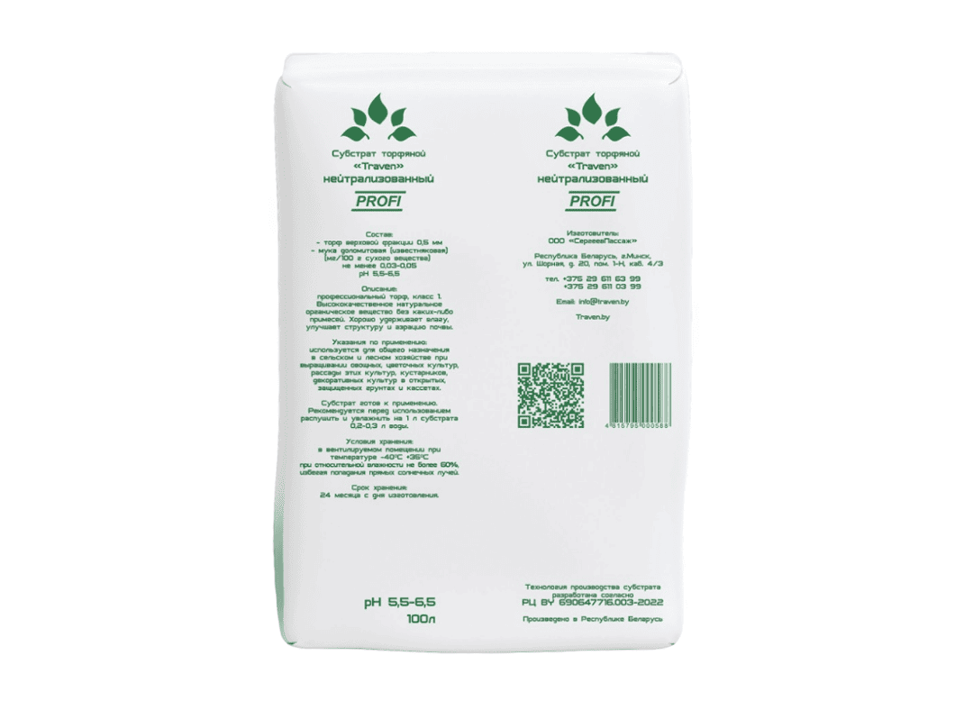 Нейтрализованный верховой торф Traven (объем упаковки - 100 л) представляет собой превосходную основу для культивирования различных растений. Его сбалансированная кислотность и наличие необходимых микроэлементов способствуют созданию идеальных условий для развития корневой системы всех видов культур. Для получения данного субстрата верховой торф комбинируется с доломитовой мукой, которая способствует повышению рН до нейтрального уровня. Этот субстрат готов к использованию и не требует добавления дополнительных компонентов для улучшения свойств почвы.